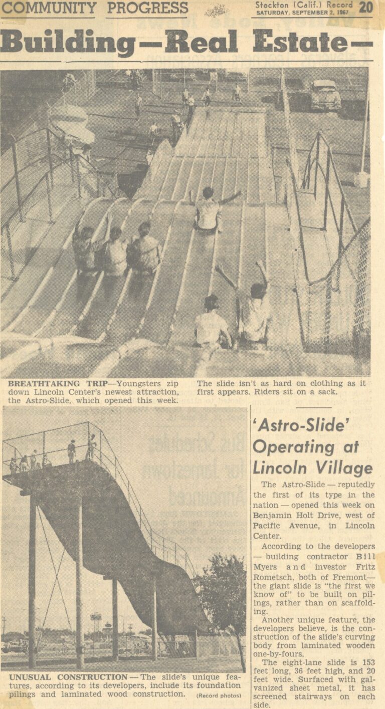 Lincoln Center unveiled the Astro-Slide, a 153-foot long, 36-foot high curved wooden slide built on pilings. Reputedly the first of its kind in the nation, riders used sacks to slide down. For a time, it was a defining landmark of Lincoln Village.